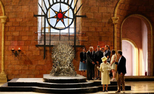 La reina recibió junto al Duque de Edimburgo una visita guiada en donde pudo ver las armas, escenografía y vestuario usado en la serie, que ha ayudado a generar alrededor de 82 millones de libras (140 millones de dólares apróximadamente) a la economía de Irlanda del Norte desde que HBO comenzó a filmar allí en 2009.