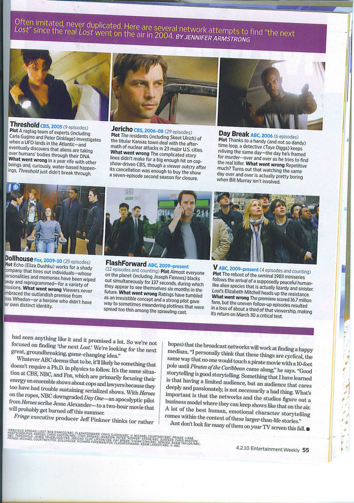 "Dollhouse". "Jericho". "Invasion". "Surface". "Day Break". Todos intentaron capturar la magia mitológica de "Lost", pero, como el vuelo 815 de Oceanic, se estrellaron durante el camino. A pesar de que los programas del género pueden ser un bombazo para la cadena, ha quedado claro durante años que no hay demasiadas series impactantes de ciencia ficción que tengan éxito. La mayoría no llegan más allá del primer año, porque las audiencias no están allí para justifficar su permanencia. "V", de la ABC, es otra ambiciosa apuesta que empezó fuerte (16,7 millones vieron el estreno), pero que luego cayó (las audiencias del episodio 4 rondaban los 11 millones). La serie vuelve el 30 ed marzo, y debe probar ser merecedora de una segunda temporada.