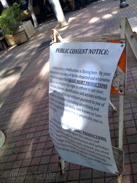 Había pósters, cajas tiradas y agua para dar sensación de humedad. Una mujer en chaqueta negra y una capucha gris sobre la cabeza corre por un callejón mientras las cámaras ruedan desde arriba (desde el edificio Thomas). Tira unas cajas mientras corre.